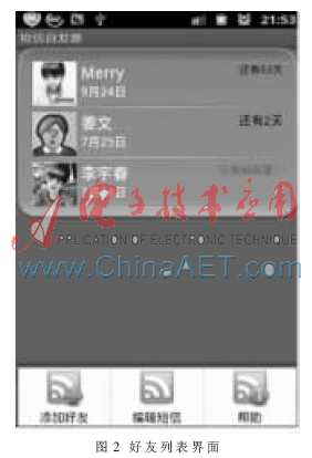 系统运行后,首先调用MainActivity.java显示主界面,如图2所示。主界面上的好友列表由ListView组件来实现,该组件中的数据由继承了BaseAdapter自定义的MainListAdapter适配器类来填充。实现代码如下: