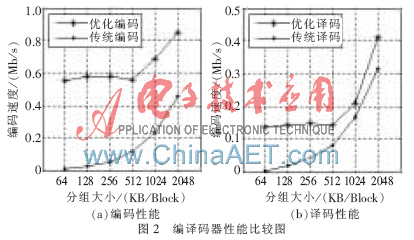 基于随机线性网络编码的原理和上述算法优化策略,本文采用C++在Linux环境下实现了传统的线性网络编码编译码器和随机线性网络编码编译码器(采用上述优化策略)。用100 MB的文件在两种编译码器上分别测试了分组大小从64 KB到2 MB的编译码运行速率。通过分析图2的编译码器性能图可以得到,经过优化策略的编译码器性能明显优于传统网络编码的编译码器。实验结果证明,将上述策略应用于网络编码的编译码器是有效的,所以选择合适大小的分组可以充分发挥编译码器的性能。