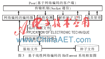当前,BitTorrent是使用最为广泛的P2P文件共享系统之一[6]。通过对BitTorrent系统工作原理、线性网络编码理论的研究和分析,将本文提出的线性网络编译码器应用到BitTorrent客户端系统中,实现基于线性网络编码的P2P文件共享系统。图3是基于线性网络编码的BitTorrent系统框架图。该系统主要由5个模块组成:(1)传输机制模块:提供Socket的通信,收发消息。(2)编码器模块:对数据进行编码。如果当前的节点是种子节点,就对原始数据进行编码;如果是非种子节点,就对当前收到的同一“代”的编码过的数据进行再次编码。(3)线性检测模块:对收到数据包的编码向量进行线性相关性的检测。如果线性无关,将该数据包存放在临时文件中;如果线性相关,将该数据包抛弃;如果临时文件存放的线性无关的数据包达到一定数量,就可以进行译码。(4)译码器模块:对收到编码过的数据包进行译码,恢复源文件。(5)成员管理模块:让当前客户端能够与系统中一定数目的其他客户端建立连接,并在运行过程中实现对与其连接的其他客户端进行淘汰和更新。