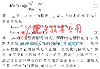 Harris角点检测算法由HARRIS C和STEPHENS M于1988年在参考文献[9]中提出,是对参考文献[10]中Moravec角点检测算子的扩展。Moravec角点检测算法的主要缺点是不能准确找出全部角点,没有对图像进行降噪处理,因此其响应对噪声敏感,尤其是对边缘响应很敏感。Harris算法受信号处理中自相关函数的启发,给出了与自相关函数联系的矩阵M。M阵的特征值是自相关函数的一阶曲率,如果在图像中某点的行列曲率值都高,则认为该点是特征点。Harris算法的表达式为: