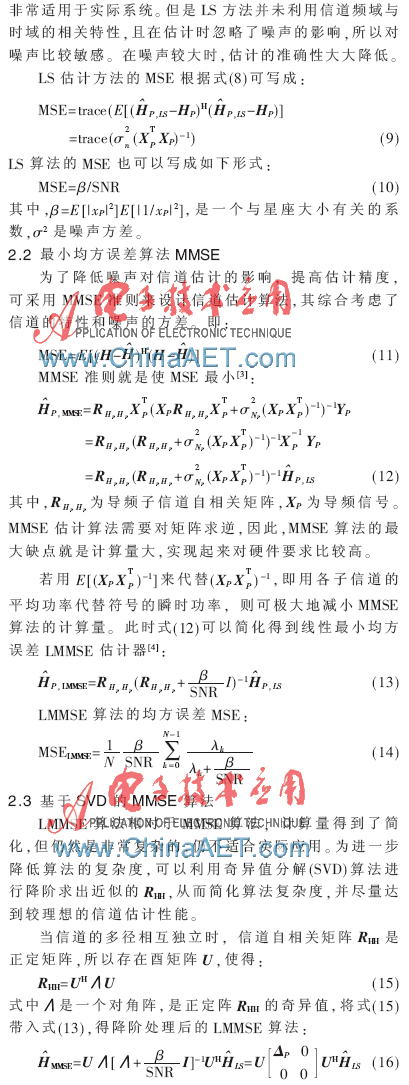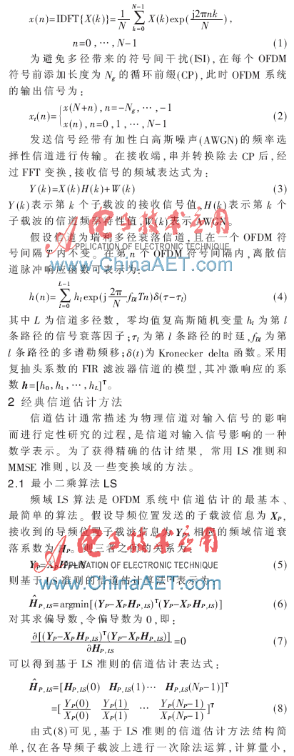 OFDM是一种多载波数字通信调制技术,通过将高速率的信息符号串并变换成低速率符号,再调制到多个正交的子载波上并行地发射,OFDM可以减小信道频率选择性衰落的影响,使其非常适合应用在宽带无线通信系统中。为了获得高精度的信道状态信息,使得系统能够获得相干检测的性能增益、多天线系统的分集和复用增益以及自适应跨层处理的性能增益,现代OFDM系统都将高精度高效的信道估计器作为系统不可缺少的组成部分[1]。