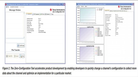 为了在开发人员对 PLC 进行初始评估时为其提供帮助,TI 推出了其配有 plcSUITE 和零配置 GUI 工具的 TMDSPLCKIT-V3 评估套件。这是一款功能强大的工具,可完成通道链路特性分析。在其零配置模式中,开发人员能够在节点之间传输数据,而无须定义任何的配置参数。这大幅度地简化了评估过程,尤其对于那些不太熟悉 PLC 实现方案细节的开发人员。