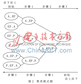 本文采用自下而上的层次聚类算法对得到的事件模式集合进行处理。层次聚类算法的基本思想是:初始状态下属于数据集的每个数据对象自成一类,它们的合并代价初始值为0;然后,假定任意两个簇合并,利用离差平方和的增量来度量两个簇合并后所需要付出的代价,在计算完所有的两个簇合并的代价后,选择合并代价最小的两个簇进行合并;算法反复迭代,直到所有的簇合并成一个簇或者达到预先设定的簇的数目k为止。Ward层次聚类算法通常采用离差平方和函数做为目标函数,如式(1)和式(2)所示。