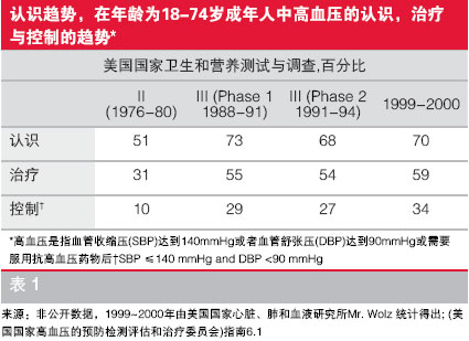 数字化血压监护让内科医生诊断出高血压并帮助他们的病人使高血压得到控制。便携式血压监护仪能让病人在家里无需医生就可以经济地测量血压,从而有助于早期诊断和高血压控制。家庭监护也可以帮助内科医生区分白大褂高血压(诊断室内血压始终增高而诊断室外血压正常)和真正的高血压。表1说明了人们对高血压的认识和控制在过去几十年间得到的改善。该表由美国国家高血压预防检测评估和治疗委员会在2004年的第七份报告中给出。