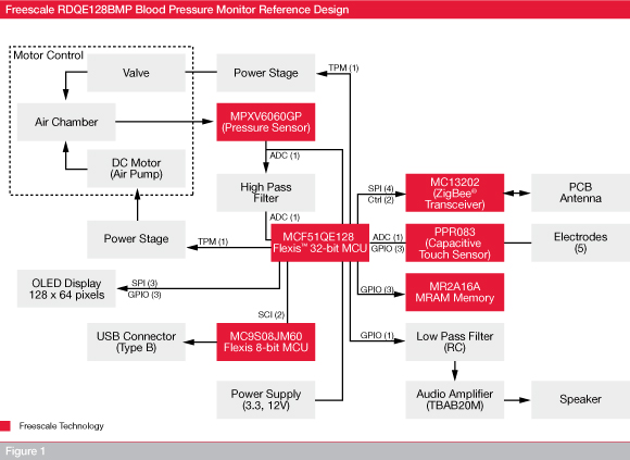 血压监护仪是当血液被泵离心脏时用来测量动脉压力的设备。典型的,从一个使用者的角度来说,这个监护仪包括一个可充气的袖套用来限制血流和一个压力计来测量血压。从一个系统设计者的角度来说,一个血压监护仪要复杂得多。它的组成部分包括:电源,电机,贮存器,压力传感器和用户接口(包括显示屏,小键盘或触摸板,发声装置,以及可选的USB或ZigBee®通讯接口)