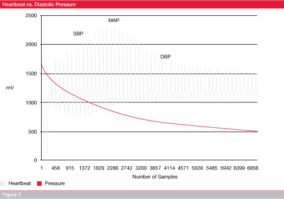 当包裹着患者手臂周围的袖套被慢慢放走时,袖套中压力的小变化(图2的红色曲线)可以被察觉。这些压力的波动由患者的心律周期产生,接着它通过一个1Hz的高通滤波后被放大和偏移,产生了灰色的血压曲线。这个新信号就是心跳信号。