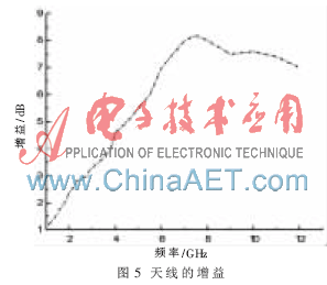 该天线在超宽带频段内有良好的增益,仿真增益如图5所示, 在2.5 GHz~11.5 GHz全频带内, 增益大于3.6 dBi。天线的仿真增益在3.6 dB~8.05 dB左右范围内波动。最大增益为8.05 dBi,比一般的微带天线的增益要大。从图5中可以看出,天线的增益随着频率的增高而逐渐增大,最大达到8.05 dBi,频率高于4.5 GHz时,天线的增益处于一个比较平坦趋势,天线在高频段的增益较高是因为天线匹配较好。因此可知此天线能达到很好的性能,满足UWB通信的需求。
