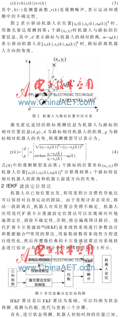 本文利用激光雷达测距传感器的观测信息来修正机器人自身的位置。机器人在运动过程中,利用测距传感器扫描周围环境,获得的观测量z(k)是周围环境路标相对于传感器的距离和方向,然后根据先验的地图信息确定自身的实际位置。在定位问题的状态空间描述中可以表示为: