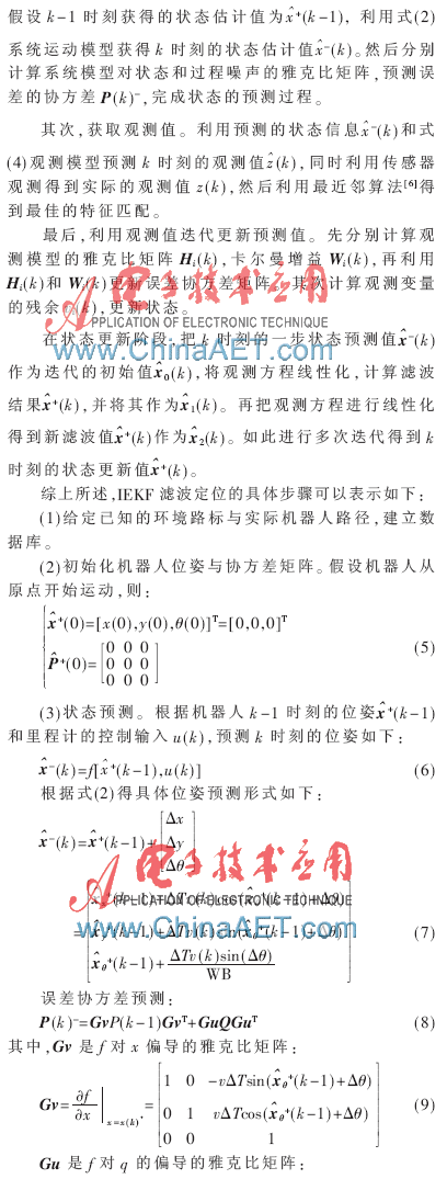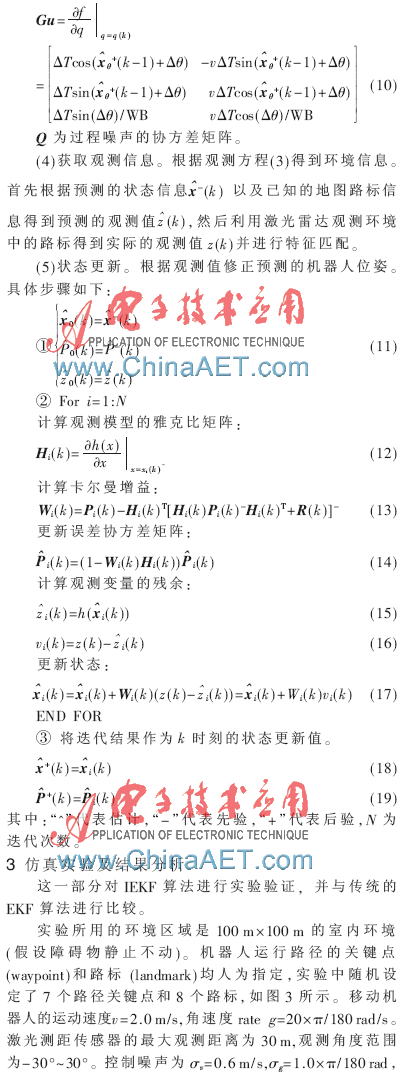 卡尔曼滤波[2]是由一系列递归数学公式描述的。它们提供了一种高效可计算的方法来估计过程的状态,并使估计均方误差最小,应用广泛且功能强大。但如果模型或系统噪声特性估计与实际不符,则会降低滤波器的精度甚至导致滤波器发散。为了解决此问题,本文结合外部环境特征信息并在测量更新阶段多次迭代滤波估计值,减小定位误差,提高系统稳定性。