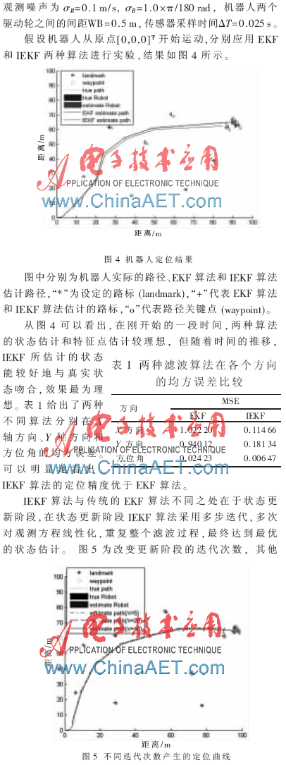 由两次实验结果可以看出,IEKF算法估计的路标特征和机器人路径与实际基本相符。从实验所得的误差数据可以看出,相对于机器人自身的空间大小,误差在可接受的范围之内,表明该定位系统定位精度较高,具有较高的可靠性。
