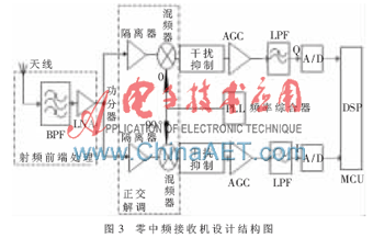 零中频(Zero-IF)[3]又称为直接下变频(Direct-Conversion)解,其方法是将信号从载波直接变频到基带。这时中频为零,镜频和自身信号重叠在一起,要采用I/Q正交的结构抑制镜像频率干扰。由于零中频接收机不需要片外高Q值带通滤波器,所以可以实现单片集成而受到广泛的重视。