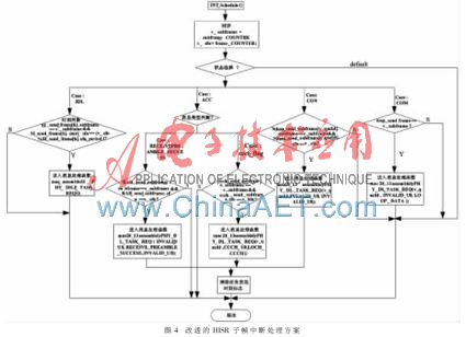 由于该方案的子帧中断只占用一个激活高优先级中断的时间,使得子帧中断的时间变得非常短,满足了子帧中断快速跳出的特性。高优先级中断的优先级别比一般任务高,在激活HISR后,在操作系统循环检测中将优先处理HISR进入HISR_Schedule函数,把消息发送至物理层,使该方案避免了任务队列的等待时间,有效满足了MAC任务的实时性。图4为改进的HISR中断服务函数示意图。