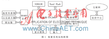 RS485总线是一种常见的串行总线标准,采用平衡发送与差分接收的方式,具有抑制共模干扰的能力。在一些要求通信距离为几十米到上千米、多节点的系统中有着广泛的应用。S3C2440的UART1通过RS485转化电路形成485总线。如图1所示,温度传感器、公交读卡器和报站器都接在485总线上,在系统运行时,微控制器将采用问答形式获得公交中的温度、人数以及站点等数据。