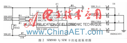 图2为SIM900与SIM卡的连接原理图。为了增强SIM卡部分的可靠性,SIM卡的所有信号线都通过连接TVS二极管来做静电(ESD)防护。设计中采用ESDALC6V1芯片作为ESD保护。SIM卡电源引脚SIM_VCC并接220 nF电容,以稳定电源输出,减小波纹。在PCB布局时,应使SIM卡卡座尽量靠近模块,图2中的电容、ESD等器件放置也应靠近SIM卡座。