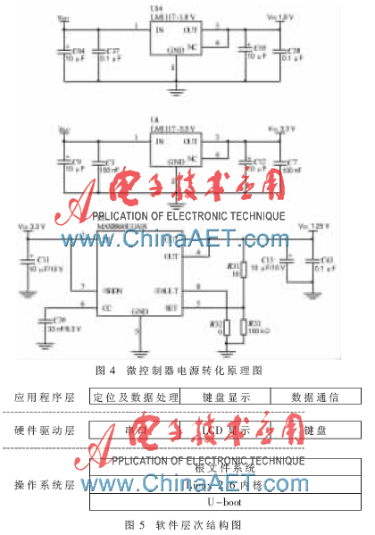 该系统硬件设计的关键在于电源部分。SIM900工作在3.4 V~4.5 V之间,由于模块射频发射时电流的峰值最高会达到2 A以上,可能导致供电电源电压跌落。因此,电源供电能力要尽可能达到2 A,以保证电压不会低于GPRS模块的工作电压。设计中选择可调输出电压芯片LM2576,LM2576输出电压范围为1.2 V~37 V,瞬间可以通过的最大电流达到3 A,符合电路要求。电源模块电路如图3所示。S3C2440控制器模块需要的1.25 V、1.8 V和3.3 V电源都由LM2576提供的5 V电源转化输出,如图4所示。为了增强模块电源抗干扰能力(主要抗浪涌、脉冲群、静电等),避免在外界环境比较恶劣的情况下出现模块供电异常,在外部电源输入端并入470 μF和0.1 μF电容,在VBAT供电芯片输出端并入470 ?滋F电容,以滤除干扰。
