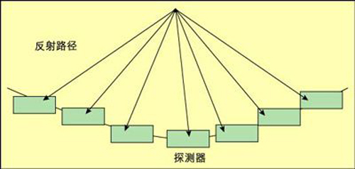 在这种技术中,将使用大量探测器(许多小雷达枪)测量从发射源返回的频率。这些探测器沿抛物线分布(如图1 所示),因此从焦点返回的信号将会同时到达每个探测器。将这些信号组合起来,并对显著速度的微小波动进行少量处理,就可以确定位于焦点处的物体的速度。如果可以移动探测器来对整个关注区域进行扫描,那么这种方法效果会相当好,但是如果没有这样的条件,则可以采用另外一种技术,它可以获得同样的结果。通过插入一定的可编程的延迟,改变各个探测器的输入组合的时间,可以将焦点改变到关注区域中的几乎任何位置。例如,加入一定的固定额外延迟可以使焦点远移,而改变延迟来缩短探测器一侧的传播路径则会使焦点向该侧移动。