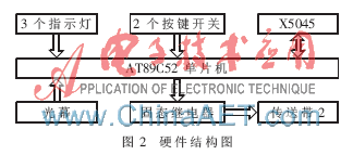 看门狗定时器采用X5045,它是一种由美国Xicor公司生产的集上电复位控制、看门狗定时器、降压管理和具有块保护功能的串行EEPROM于一体的专用集成芯片。它简化了该自动控制器的设计,减少了印制板的占用面积,其擦写周期可达100万次以上并且可以将写好的数据保存100年,大大提高了产品的可靠性[2]。