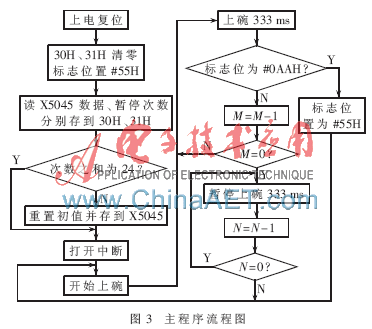 单片机上电后,首先进行复位,设定堆栈,然后清空地址为30H和31H存储单元中的数据并且设置标志位为#55H,读取X5045中的数据即上碗的时间和暂停的时间,由于上碗和暂停的总时间是固定的,所以程序在此将两个时间累加并与总时间相比较。若两者不等,说明读取的数据有错误,程序将自动给这两个时间值重新赋默认初值,并存入X5045中;若两者相等,则将定时/计数器初始化,打开定时/计数器中断并且开启固态继电器,上碗和暂停指示灯分别点亮和熄灭,按照存储在X5045中的PWM中的占空比值控制上碗与暂停时间的长短,并且在上碗的时间内每隔333 ms判断一下标志位是否为#0AAH,若不是则继续上碗直到上碗时间结束;若是则将标志位置为#55H,直接重新开始一个PWM周期循环,重新上碗。上碗时间结束后,上碗指示灯熄灭,暂停指示灯点亮。暂停上碗到足够的时间后,程序将重新开始一个PWM周期,重新上碗。系统运行指示灯则在每个PWM周期后取反,闪烁表示系统正常运行。