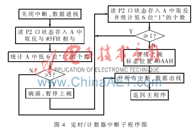 定时/计数器中断服务程序的中断时间设置为111 ms。在PWM周期内,每当定时/计数器计数时间到后,主程序暂停执行,进入中断服务程序。首先关闭中断,数据进栈,检测6个对射式光电开关的导通情况,把它们的输出信号传到单片机P2口转换为高低电平信号,读取P2口的状态并存到寄存器A中,取反后与#3FH相与除去干扰位。单片机P2口低6位的高电平的个数即为检测位置存在碗的个数。将A依次右移6次即可知道A中高电平的个数即存在碗的个数,然后通过控制PWM的占空比调整流水线上供碗的个数。在这里可以设置5作为碗已满的一个界限。如果A中高电平的个数没有超过这个界限,程序跳出当前中断,继续执行主程序;如果超过这个界限,单片机将通过控制电平的高低将固态继电器断开,暂停上碗,再次重复读取P2口状态并统计低6位中的高电平的个数,如果高电平的个数大于等于1,视为碗目前仍处于满的状态,系统仍处于中断服务程序中继续循环检测“1”的个数,直到高电平的个数小于1,使固态继电器处于接通状态继续上碗,将标志位置为#0AAH,然后打开中断,在数据出栈后,跳出当前中断程序,继续运行主程序。定时/计数器中断子程序图如图4所示。