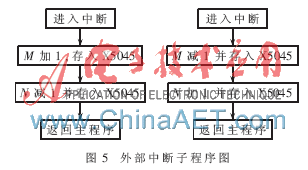 两个按键开关通过两个外部中断实现,进入中断后,根据按键是增加键还是减少键,对M和N实行相应的加减处理并存放到X5045中,然后返回主程序。其中M代表设定的上碗时间份数,N代表设定的暂停时间份数。外部中断子程序图如图5所示。
