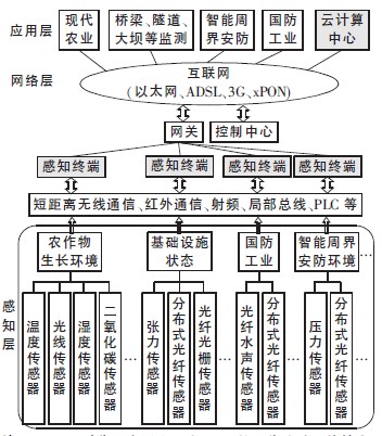 由上述物联网的基本知识可知,在物联网中需要大量的传感器来感知各种各样的环境参数,为物联网提供最原始的数据信息,然后通过处理得到人们所需要的结果。因此传感器是物联网的核心,基于物联网的光纤传感技术应用方案如图1所示。