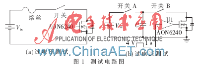 过电压测试的电路图如图1(a)所示,选用40 V的功率MOSFET:AON6240,DFN5?鄢6封装。通过开关来控制,将60 V的电压直接加到AON6240的D极和S极,熔丝用来保护测试系统,功率MOSFET损坏后,将电源断开。测试样品数量为5片。
