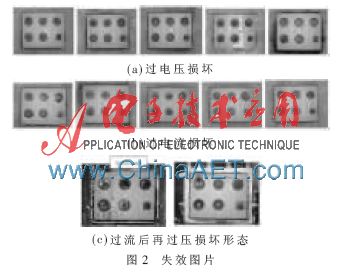 从图2(b)可以看到,在过流损坏的条件下,所有的损坏位置都发生在S极,而且比较靠近G极。这是因为电容放电形成大的电流流过功率MOSFET管,所有的电流汇集于S极,此时温度最高,最容易产生损坏。