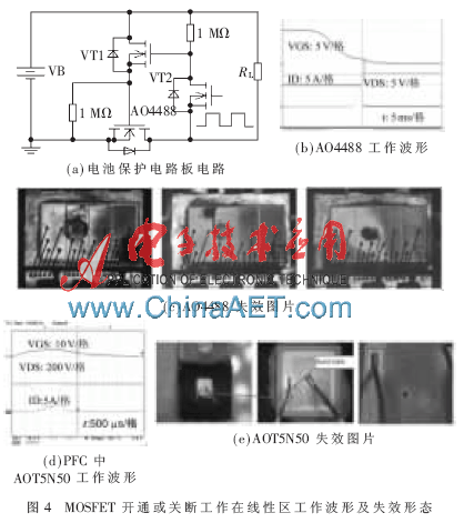 图4(e)是器件 AOT5N50在一个实际应用中,在动态老化测试过程发生失效的图片。起动过程中,MOSFET实际驱动电压为5 V,MOSFET工作在线性区,失效形态与图4(c)相同。