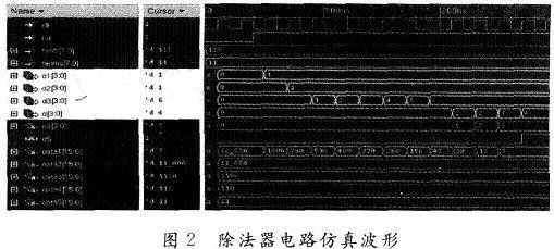 对上述的流程图用Verilog描述语言编程,在Ca—dence的NC—Verilog仿真器下仿真,设输入的Ienzi和fenmu的值分别为128和11,仿真波形如图2所示。