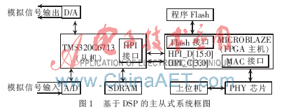 系统采用基于DSP的主从式双CPU,如图1所示。选用Xilinx公司的V5系列FPGA作为系统的控制单元,内部运行嵌入式MicroBlaze处理器用来作为主机,负责网络数据的接收、解析、HPI接口的控制、Flash存储器的读写等工作。TMS320C6713主要完成和外部信号的接口,完成信号处理算法的实现,可以通过网络对其算法程序进行不断的修改,以达到最佳的信号处理效果。从图1可以看出,DSP与FPGA之间通过HPI接口连接,DSP还负责模拟信号的采集和输出。