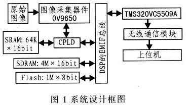 图1为该系统设计框图。该系统分为图像采集、图像数据处理及无线通信3个模块。图像采集完成图像数据的采集;图像处理实现图像数据的压缩及相关处理:无线通信传输压缩数据。该系统选用TMS320VC5509A型DSP作为主处理器。