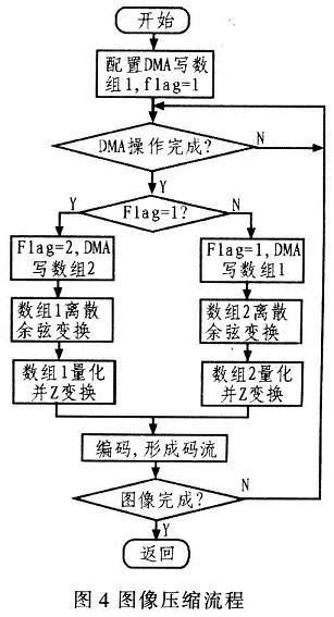 该系统采用JPEG压缩算法,该算法是将图像数据分成8x8的矩阵块、离散余弦变换、量化、Z(Zigzag)形扫描和Huffman编码,图像数据JPEG压缩时。需要分块处理DSP外围存储器中的图像数据。CPU对外围存储器的读写操作要慢于内部DRAM存储区。为提高图像压缩速度,在算法移植时,内部DARAM建立两个8x8的矩阵单元,DMA将外部存储器的图像数据以8x8的矩阵块为单元传输到到内部DARAM中的一个数组中,同时实现JPEG算法的分块操作。利用DMA与CPU并行工作的特性,在CPU操作一个块时,另一分块传输数据,两个数组交替进行,构成乒乓结构。图像压缩过程中需多次配置DMA,才能实现整个图像数据从外存到内存的传输和数据分块。数据块依次经离散余弦变换、量化、Z变换及哈夫曼编码,形成JPEG码流。图4为图像压缩的程序流程。