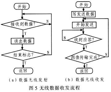 图5(a)为数据无线发射的程序流程。在数据接收端接收数据,同样先配置相关寄存器,设置为接收模式,延时130μs后进入接收状态等待接收数据。当接收方检测到有效地址和CRC校验码时,自动去除数据包头和CRC校验码,存储数据至接收堆栈中,更改状态寄存器相应位,通知CPU读取数据。若开启自动应答,接收端进入发射状态发射应答信号。图5(b)为数据无线收发的程序流程。