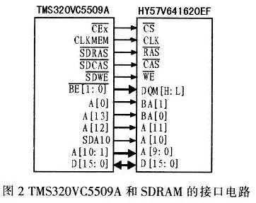 TMS320VC5509A内部仅有256 KB的RAM和64 KB的ROM,无法满足处理大量图像数据的需求,必须通过EMIF扩展外部存储器存放原始图像数据和应用程序。该系统外接Hynix公司HY57V641620EP SDRAM,其8 MB的存储空间用于存储图像数据;外接Spansion公司的S29AL008D Flash,其1 MB的存储空间用于存储应用程序和Boofloader。EMIF可与SDRAM无缝连接,接口连接如图2所示。由于TMS320VC5509A最大只能外扩16 KB的异步存储器,因此访问1 MB Flash需按分页方式访问,连接示意图如图3所示。