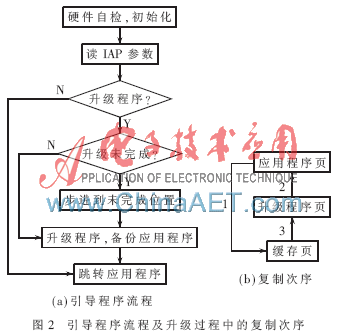 为了确保系统可用型,升级过程中先要备份当前版本应用程序,通过一个缓存页面,升级程序和应用程序按Flash页块进行交换,复制次序如图2(b)所示,确保升级过程既不破坏原有版本程序代码,也不丢失新版本程序。