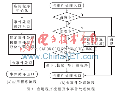 应用程序完成所需设备功能后,还需要实现读取升级卡写入升级程序区,或者通过管理卡设置回滚标志,在应用程序的卡处理过程中增加升级卡处理,应用程序流程如图3(a)所示。