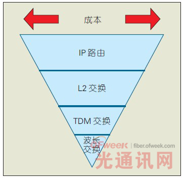 ROADM 设备从名称上很容易被理解为OADM 设备增加了可重构特性,但实际上目前ROADM 设备不仅具OADM 设备的全部功能,还兼备了OXC 设备的部分功能。具体来讲,ROADM 设备支持波长通道上下路状态的灵活配置,多维ROADM 设备还支持波长通道在各个维度(方向)之间灵活调度。相对于电信网络应用的其他交换或交叉连接技术相比,ROADM 提供的波长层面最大的优势是低成本、高效率,图1 给出了各层网络交换技术的成本对比关系。