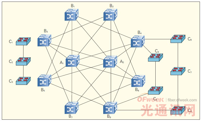 大型城域/本地传送网可以分成核心、汇聚和接入3 层,中小型网络可能是两层。总体来讲,城域/本地ROADM 网络的层次化结构是相当清晰的,如图3 所示,A、B、C 分别代表网络的核心层、汇聚层和接入层。