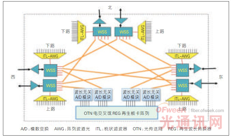 骨干网由于地理范围大,且节点分布不均匀,ROADM 设备必须考虑OEO 再生问题,而且对于多维ROADM 设备,普遍存在部分方向对之间需要再生,其余方向对不需要再生的情况。一方面在网络规划中需要考虑全光域范围的问题,将全网分成若干个子网,子网内部业务连接尽量不需要OEO 再生,发挥ROADM 组网的低成本优势;另一方面也需要ROADM 设备在必要的情况以低成本和高效率提供OEO 再生能力。