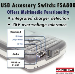 USB附件开关产品FSA800是业界最小的器件,将所有主要的多媒体功能集成进薄型UMLP封装(1.8mmx 2.6mm x 0.55mm)中。它具有内置充电检测功能、28V的过压容差、内置终止电阻器,以及负摆幅功能。通过在紧凑型封装中集成了多种功能,可以简化便携设计并减少外部元件数目。