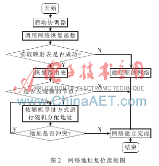 为确保将数据发送到正确的设备上,在协议栈开发的基础上提出了具有复位网络短地址能力的解决方案(只是针对协调器被替换或重新组成了新的个域网的情况)。首先在网络正常时备份网络短地址映射表,将网络节点的64位扩展地址与网络短地址一一对应,这样可以在新的网络未组建之前选择通信信道时,调用应用层网络恢复函数读取网络短地址映射表[3]。若该函数读取失败则返回READADDRLIST_ERROR,协调器将会建立新的网络连接,此时所有节点的网络地址将会被更新。若读取成功,则协调器将会以64位的扩展地址进行路由发现。在发现完成后,利用映射表将64位扩展地址映射成16位网络地址,这样就恢复了先前的网络。在路由发现过程中若出现新的64位扩展地址,协调器则将其视为新的子节点,并随机分配新的网络地址,同时对新分配的网络地址进行监测调控,保证不与其余的网络短地址发生冲突。但该方案仅针对于协调器而言,如果想保证所有节点数据包的可靠传递,则必须有应用层上相应的配置,使得数据在传输之前将64位扩展地址转化为16位网络地址。整体流程如图2所示。