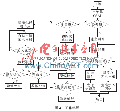 系统中协调器、路由器和终端节点整体的工作流程如图4所示。其中,终端节点的异常处理是指电流、电压或温度异常,这些异常状况都会导致LED路灯自动关闭。协调器接收到的应用事件包括:各节点上传数据、上位机发送的控制指令,以及协调器自我监控。