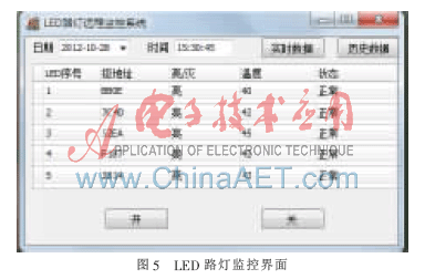 在构造实验系统时配置了一个网络协调器,两个路由器节点和三个终端节点。路由节点和终端节点分别控制5盏LED路灯,协调器则通过串口与上位机相连。经测试,在开阔处ZigBee有效通信距离可达80 m,符合LED路灯要求。同时通过上位机监控界面对LED路灯进行简单的开关控制,并在监控界面上将各LED路灯的亮灭情况、短地址、温度、状态等参数显示出来。监控界面是用DELPHI2010编写的,可以实时显示LED路灯状况,方便监控人员监控,并且可调出以往数据方便查询。图5为在实验室条件下监测到的5盏LED路灯状态,可发现系统工作正常,符合要求。