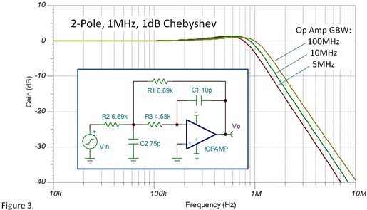 对于有源滤波器的设计,很难判断增益带宽积的需求,它是一个可以应用这种技术的很好的例子。图3中使用FilterPro来设计切比雪夫滤波器,它会给出一些增益带宽积值的推荐,然而它的设计准则可能会比一些情况更严格。对于这个设计而言,它推荐了100MHz或更大的增益带宽积来达到近乎理想的滤波器设计特性。如图2所示,我设定三种增益带宽积(5MHz,10MHz,100MHz)来对设计进行仿真。从结果中可以得出小于100MHz的增益带宽积已经是符合要求的。对于最终的仿真,你应该使用你所选择的运算放大器的宏模型。