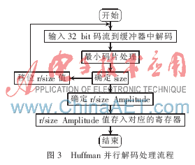 在码流分析中,确定Huffman并行解码的相关信息后进行解码。对JPEG来说,最终要找到AC=0的个数Run、AC的位数Size和幅度Amplitude,以及DC的Size和Amplitude。在JPEG中,AC和DC分别是交流系数和直流系数,其中AC和DC各自又包含色度和亮度。进行一次Huffman并行解码处理流程是整个Huffman并行解码器的关键流程之一,处理流程如图3所示。