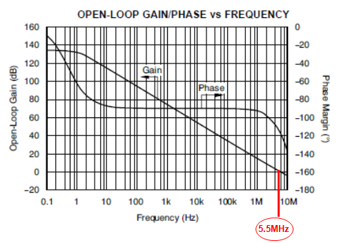 还是想写篇贴子对这个参数深刨根一下,(赵大叔小品“往祖坟上刨”)。对于单极点响应,开环增益以6 dB/倍频程下降。这就是说,如果我们将频率增加一倍,增益会下降两倍。相反,如果使频率减半,则开环增益会增加一倍,结果产生所谓的增益带宽积。下表就是运放OPA376的datasheet中给出的增益带宽积典型值5.5MHz。