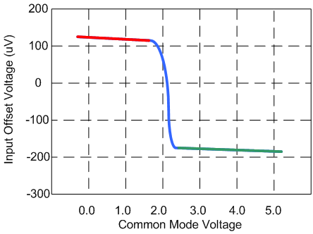 下图是这种运放的输入失调电压可以看出。随着共模电压的升高PMOS在2V(用于举例的值)左右将关闭,而NMOS即将打开,就在这个节骨眼上。运放的输入失调电压变生了跳变。这个可以理解,两组不同结构的输入级的输入失调电压是不同的,在交接棒时,这个失调电压也完成了交接棒。对于直流信号这个问题会引起误差突变,对于正弦交流信号,这个问题会引起信号的失真。在交越点引入一个小小的台阶。
