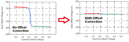 到这并没有结束,另一种技术在TI的单电源轨至轨运放中得到应用。这就是自调零技术。下图使用了自调零技术(MOSFET Zero Drift)前后。输入失调电压跳变就非常小了。