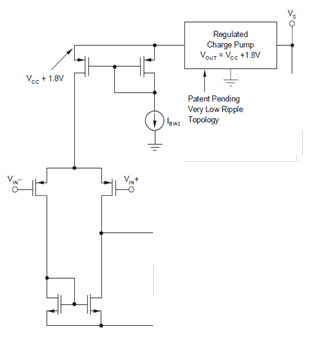 为了解决这个问题,TI公司设计了两种领先的差分输入级。第一种结构如下图。PMOS差分输入级能达到负电源轨,而达不到正电源轨,总是差这么1V左右够不着。我们把输入级的电源在内部提高1.8V。水涨船高,这样的输入级就能达到运放的正电源轨。由于只有一组差分输入级,并不会存在输入失调电压交越的问题。