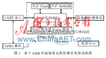 基于ARM的温湿度远程监测系统是能够运行嵌入式操作系统的软硬件综合体,其体积较小,智能程度高,利用通用分组无线业务GPRS(General Packet Radio Service)网络无线数据传输技术实现温湿度的远程实时监测。